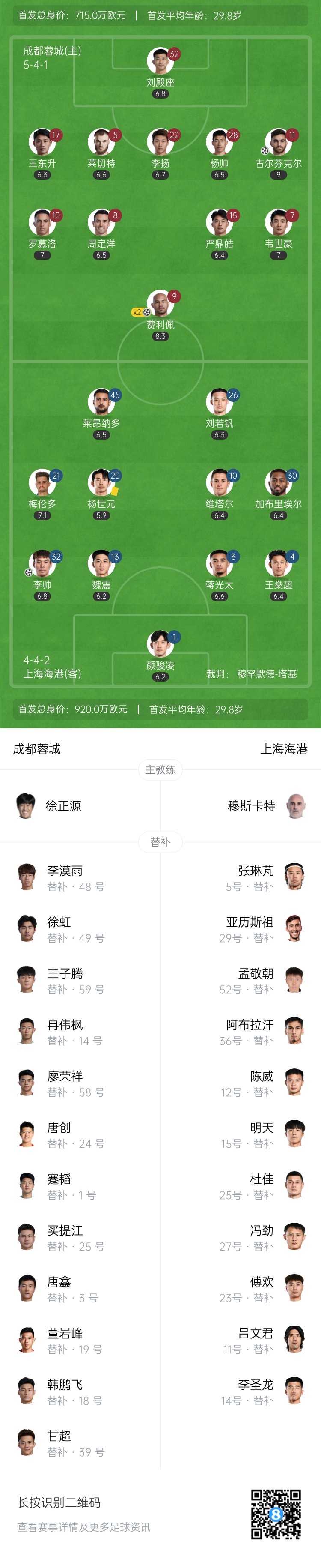 第30分钟,费利佩主罚点球命中,完成双响,蓉城3-0领先↓