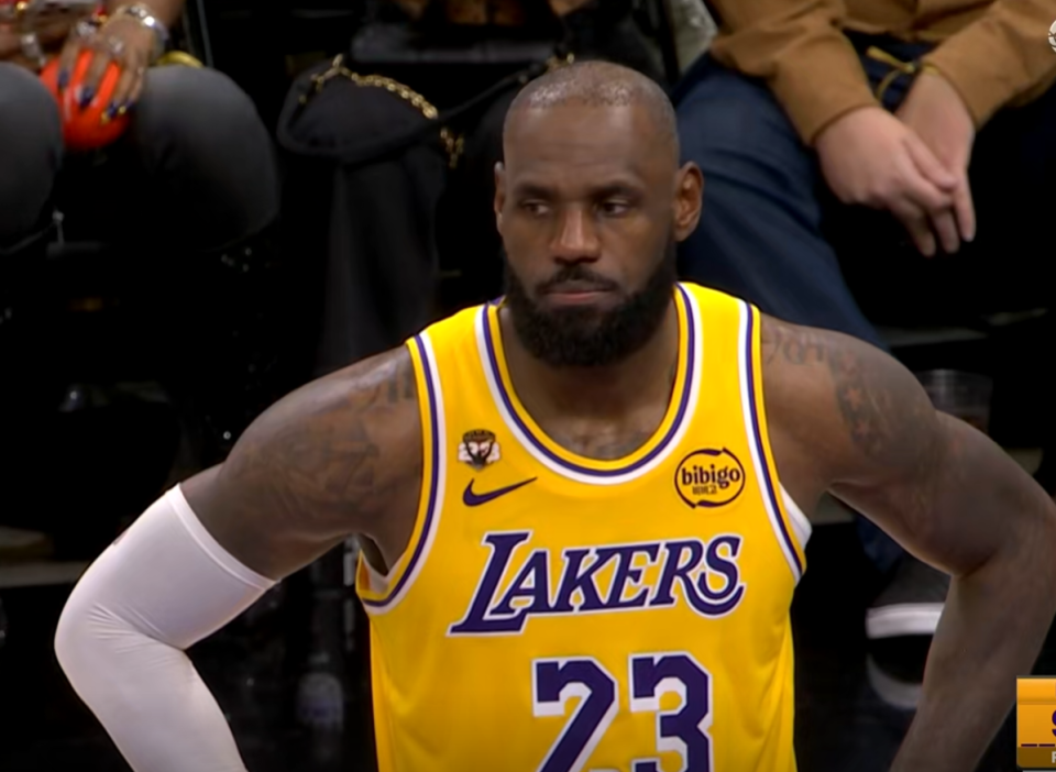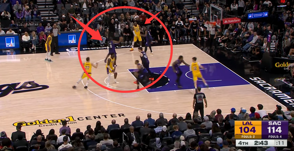 詹姆斯最后五分钟被换上场,他替换下去的是范德比尔特,而当时本来双方的分差是12分,本来湖人还有机会,结果詹姆斯上来之后一己之力送掉了比赛。首先詹皇上场之后一分没拿,也没有任何的正面数据贡献,甚至连一个助攻都没有送出来,那他上来之后到底干了些什么呢?他用一攻一防直接坑死了洛杉矶湖人。