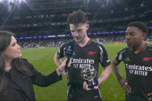 体育资讯04月17日讯 欧冠1/4决赛首回合,阿森纳客场2-1皇马,赛后阿森纳中场赖斯接受采访。